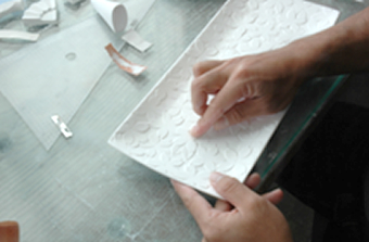 手書きのデザインラフを基に3Dモデリングソフトを使って、ベースとなるイメージを作成します。そしてマシーンで石膏を削りだしていきます。ハンドシェイプが困難な形状やレリーフを精確に作ることが可能です。